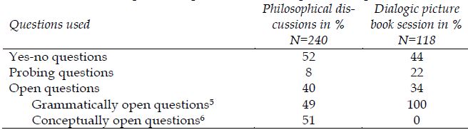 In the philosophical discussions, the proportion of yes-no questions and open questions was higher than for the dialogic picture book sessions. This difference was to be expected because the request to adopt and justify a position is mostly made in the form of these two question types and is characteristic of the speech acts of discussion leaders in philosophical discussion. Detailed analysis of the open questions, however, also shows that in the dialogic picture book sessions only grammatically open questions were posed that were often geared towards the understanding of the story itself; whereas in the philosophical discussions, over 50% including conceptually open questions, i.e. philosophical questions, were posed to which there are no generally accepted answers.