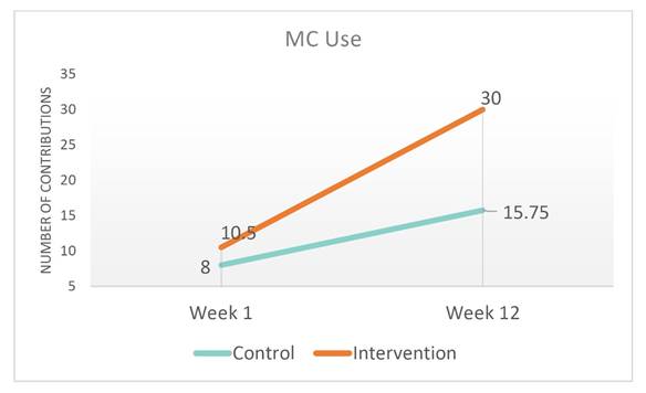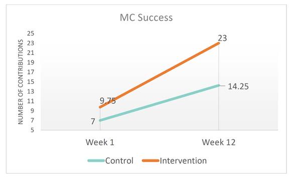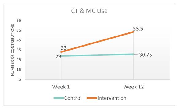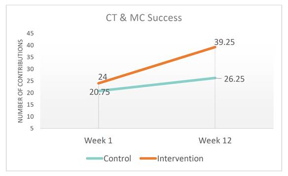 Over the 12 weeks the control group increased their successful use of CT skills and MC skills from 20.75 in week 1 to 26.25 in week 12. This is a 26% increase. The intervention group raised their successful use of CT and MC skills from 24 in week 1 to 39.25 in week 12, a 63% increase.