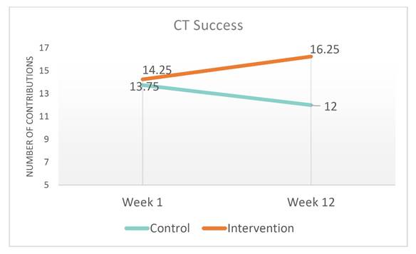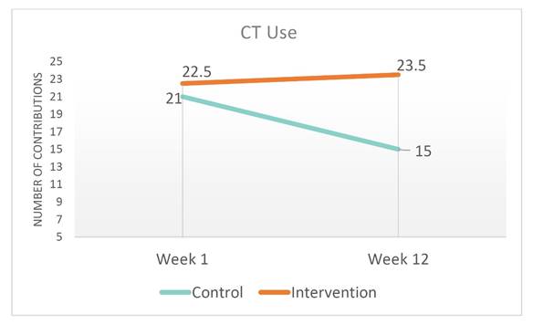 The control group decreased both their use and their successful use of CT skills between weeks 1 and week 12. Their use went down from 21 in week 1 to 15 in week 12 (29% decrease) and successful use went down from 13.75 in week 1 to 12 in week 12 - a 13% decrease. The intervention group on the other hand increased their use by 4.5% - in week 1 they used 22.5 CT skills and in week 12, 23.5 CT skills. Their success rate increased by 14% - with 14.25 CT skills being successful in week 1 and 16.25 being successful in week 12.