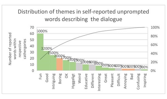 The children reported that they enjoyed the dialogues and experienced them as a supportive learning environment in which they could share their ideas freely. The prevalence of unprompted positive words associated with the dialogues was high, and throughout the week the vast majority of the children thought that the dialogues were fun and contained themes that they found interesting.