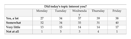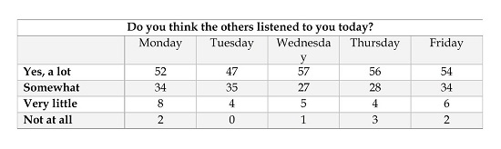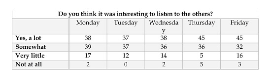 We also asked them the following question: “Do you think it was interesting to listen to the others?” Many children indicated that it was. However, throughout the week, there were also groups of children (ranging from five to 17) who reported that it was not very interesting to listen to the others (see Table 8).