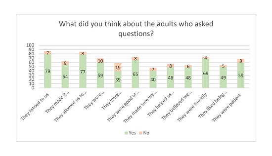 In addition to the predefined multiple-choice tick boxes, we gave the children the opportunity to provide additional free-text answers to the two sets of mirrored questions. Only a few (a total of 14) additional responses were provided. Some children further highlighted their already positive experiences with the facilitators: “They were SO sweet” or “They were nice all the time.” Others described negative experiences: “I did not think they were patient. And they interrupted us a lot”; or “They were just annoying.” In addition, some of the elaborate answers emphasised the fact that the facilitators were either boring or kept asking the same question. One child responded as follows: “It was as if they were not there. as if they were playing a computer game.”