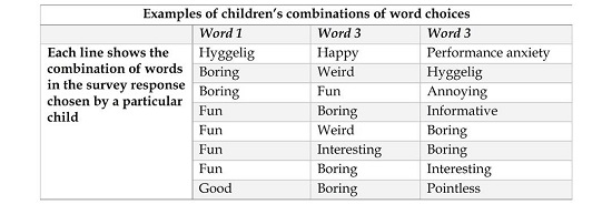 An interesting finding was that many of the children offered notable combinations of words. For instance, the child who chose the word “performance anxiety” also chose the words “hyggelig” and “happy” to describe the dialogues. While this may seem like a combination of semantically contradictory words, it may be the case that the combination, in fact, matches the child’s complex experience. Similar cases of notable combinations are shown in Table 1.