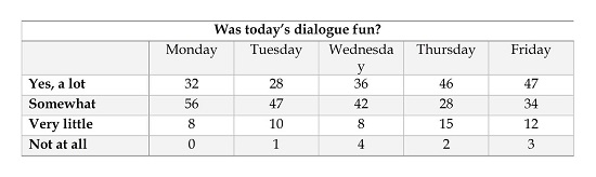 The level of satisfaction indicated in our study’s post-survey mirrors the answers in the daily surveys, in which we asked the children the following questions: “Was today’s dialogue fun?” and “Did today’s topic interest you?” We found that throughout the week, the vast majority of the children considered the dialogue very fun or somewhat fun (answering “Yes, a lot” or “Somewhat”). A small minority of the children indicated that they thought the dialogue was not fun (answering “Very little”) and a minor fraction indicated that the dialogue was not fun at all (answering “Not at all”) (see Table 2). The children’s responses to whether they found the topic of the day interesting matched their answers regarding fun (see Table 3).