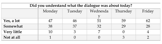 In the daily surveys, we asked the children the following question: “Did you understand what the dialogue was about today?” A very high percentage of the children answered that they did. Only a small proportion of the children replied that they did not understand what the dialogues were about, as illustrated in Table 4.