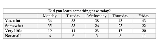 Not only did the children appear to understand the meaning and character of the dialogues, they also reported that they thought that they had learnt something new during the dialogues. In the daily surveys, we asked the children the following question: “Did you learn something new today?” The vast majority answered that they had, in fact, learnt something new (see Table 4).