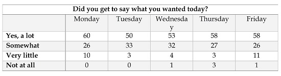 When asked “Did you get to say what you wanted today?” in the daily surveys, very few children answered that they did not get the chance to say what they wanted to or that they did so to a smaller degree than they would have wished. Throughout the five days, the children consistently reported that they participated to the extent they wanted to (see Table 7).