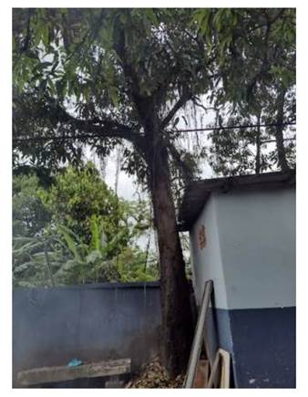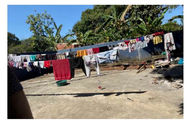 Algumas mulheres sentadas em tecidos, vestígios de uma fogueira no chão do pátio externo, algumas árvores de grande estatura também plantadas no espaço externo e uma boneca (sem roupa) aos pés de uma das árvores, que além da bola, foram os únicos brinquedos identificados na primeira visita.
