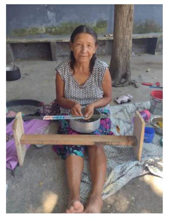 Aos poucos, íamos nos misturando ao grupo, sempre sob o olhar atento do Seu Gerônimo. Soubemos então que na véspera uma das mulheres passou mal e desmaiou, ficando com as mãos tortas durante o processo. Imediatamente reagimos perguntando se ela havia sido socorrida ao médico. Fomos esclarecidas que o Cacique havia feito uma reza para espantar o espírito mal, causador do evento e morador de uma das árvores localizada no pátio da escola. O grupo havia solicitado a remoção da árvore, o que não teria sido permitido pela Secretaria Municipal de Parques e Jardins. As mulheres nos relataram que à noite escutavam a árvore chorar e os grupos evitavam sair das salas de aula transformadas em quartos pelo temor que o espírito maligno causava. Diante da negativa de sua remoção, diariamente acendiam uma fogueira na raiz da árvore, na tentativa de matá-la.