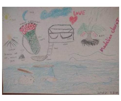 O desenho rico em detalhes de Madeline nos apresenta aspectos de sua existência antes da chegada ao Brasil. O encontro com a cultura ocidental por sua vez, revela-se na palavra love acima de um coração vermelho, apontando a influência do idioma inglês na forma como vê o mundo. Chama atenção que a palavra escolhida se refira ao amor, possivelmente identificado por Madeline como elemento presente na sua existência anterior. Ainda assim, a escolha de um quarto idioma para sua manifestação (nem Warao, nem espanhol, nem português) não deixa de causar estranheza e nos coloca diante de uma perspectiva onde indígenas e brasileiros podem ser percebidos como subalternizados em relações de colonização.
