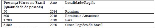 A saída dos grupos de seus territórios de origem é demasiadamente marcada pela exploração petrolífera que afetou profundamente o ecossistema, causando falta de água potável, destruindo peixes e camarões, trazendo doenças, contaminando o solo e os rios. O deslocamento, no entanto, não apaga as marcas étnicas de pertencimento indígena e os laços familiares, tais como compreendidos por eles. Tais caraterísticas provocam algumas situações de desacordo com as instâncias da região orientadas por valores culturais locais. A presença dos Waraos no Brasil é registrada desde 2014 (ACNUR, 2021), mas é em 2016, com agravamento da crise venezuelana, que teve início um processo migratório mais intenso, como revela a tabela a seguir: