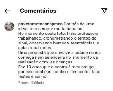Ao ser convidada a seguir o grupo pertencente ao projetomotocanapraça, passo a me entender como participante aceita, cujos passos tornam-se vistos, já que me tornei seguidora do grupo virtual dentro desta mesma rede. Com isso, deixo de ocupar o lugar de certa passividade de observadora, pelas janelas da web, e me torno alguém cuja participação, ainda que exígua e virtual, torna-se mais frequente e perdura para além do tempo da escrita deste texto. Não busco analisar mídias sociais exatamente, o que configuraria um trabalho inteiramente netnográfico, mas fazer um uso combinado, como já mencionado, considerando entrevista gravada, caminhadas, imagens e vídeos no Instagram e diálogos pelo WhatsApp. Recorro às imagens escolhidas pela professora e pelas crianças para serem postadas nessa rede social. Ademais, ciente de que se trata de filtros importantes que decidem o que mostrar e o que não mostrar, opto por seguir com elas e refletir sobre a presença das crianças na Praça e o projeto em realização contínua.
