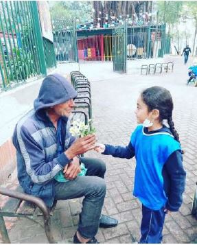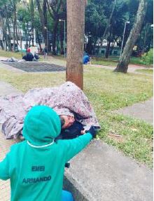 Se a materialidade da Praça provoca a pensar sobre certo acolhimento devido à presença das árvores, lagos e animais, emblematicamente, ela leva a existência de práticas de contensão e confinamento. Aquiescer a elas seria o mais comum. A presença de uma grande população de rua, segundo dados oficiais do primeiro censo de população de rua do município de São Paulo, que identifica 32 mil pessoas14, tem produzido as mais diversas relações e reações, ora de rechaço, ora de acolhimento. As fotografias 10,11,12 e 13 permitem a identificação de práticas que ensejam um processo de aproximação. Identifico as flores doadas como objeto de mediação social que poderia quebrar o distanciamento entre as crianças e adultas/os/es, entre as demais pessoas que frequentemente são rechaçadas. Combina-se a precariedade da vida à singeleza possível nos gestos de crianças e de quem com elas interage. Embora mais restrita a práticas descolonizadoras, retomo Cusicanqui (2022, p. 101) quando afirma que não pode haver um discurso descolonizar sem uma prática descolonizadora. Essas práticas provocam desdobramentos dessa afirmação, qual seja, implica as crianças, e remete ao projeto pedagógico da professora e da escola a importância de pensar e atuar no sentido contrário a ações de subalternização, desconhecimento e naturalização dos estados sociais em que as pessoas se encontram.