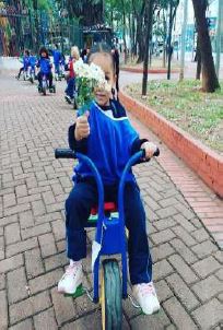O levantar de mãos em aceno às crianças, o girar do corpo e da cabeça seguindo-as enquanto passam pelas ruas e calçadas, como vistos nas fotografias 6, 7 e 8, portam alguns elementos para pensarmos sobre as relações estabelecidas com as crianças, ainda que distanciada fisicamente. As imagens fotográficas, cujo objetivo, segundo Lívia, é produzir uma narrativa imagética do projeto, mais do que mostrar o que aconteceu, contém grande riqueza e podem dar indícios para se perceber as transformações socioculturais da cidade, bem como as contradições presentes. Não se percebe uma interação verbal mais demorada entre as crianças e as pessoas adultas, talvez, algumas palavras sejam proferidas de modo breve. Além das motocas que remetem a outro tempo, observa-se as crianças que vão pedalando, conferindo um ritmo diferente de andar, elas usam coletinhos ora amarelos, ora de cor laranja, como marca que lhes identificam junto às demais pessoas fora da EMEI.