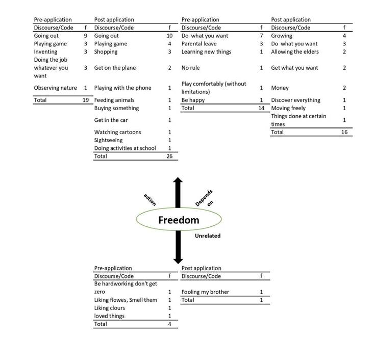 When children made statements about the meaning of a concept, they also used unrelated expressions; however, in current practice, these irrelevant expressions decreased; it was determined that right-meaning discourses about the concept of freedom increased after the activity. However, it saw that with the last application, student discourses expanded with phrases such as rules, money, and independence. Aydemir and Kalın (2018) studied the changes in their judgments of the values of independence, freedom, self-confidence, and modernity in 8th-grade students before and after values education. Children especially perceived freedom as travel, after school, vacation, and a physical education lesson due to the research in the pre-application. They described it as freedom, rights, a statute of liberty, law, democracy, and justice in the last application. Karasu (2018) found that students' perception of freedom changed after the activities; the answers about freedom, which were initially given at the level of understanding, started to be given at the level of evaluation. The success of the activities carried out with children in the research and the value education provided might explain this variation in children's discourses or perspectives.