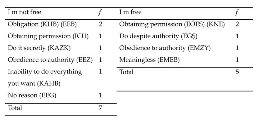 The children were then instructed to “stand on the yellow cardboard on the floor if they think they are free, and stand on the red cardboard if they think that they are not free”. They should explain why they are free or not. The children's answers to the questions about freedom were categorized under the titles "I am free" and “I am not free” based on their decision status for each question, and the reasons for the answers they gave were examined individually. As a result of this investigation, several codes were discovered. These are summarized in the following table.