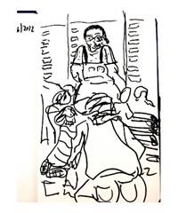 No entanto, esta foi a primeira (e única) vez que os visitantes se encontraram juntos7 dentro de uma sala com crianças, eles próprios com percursos e experiências diferentes na área. Entre temas e técnicas diversas (sem acordo prévio), trocaram palavras, inspirações e emoções, fizeram um desenho coletivo e muitas outras pequenas grandes coisas que não cabem neste texto. Apesar de uma das afirmações iniciais do educador anfitrião ter sido um peremptório “aqui há regras!”, como que estabelecendo claramente a sua autoridade, queremos focar aqui a forma como a atividade daquele dia terminou.