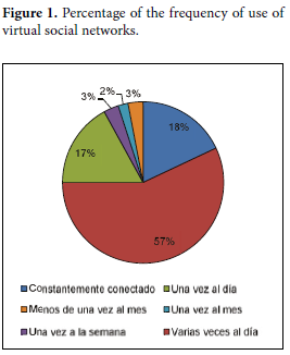 Most of the sample, 74.1%, reported being connected to virtual social networks “several times a day” or being “constantly connected,” compared to 4.5% who did it “once a month,” or “less than once a month” as we see in figure 1.