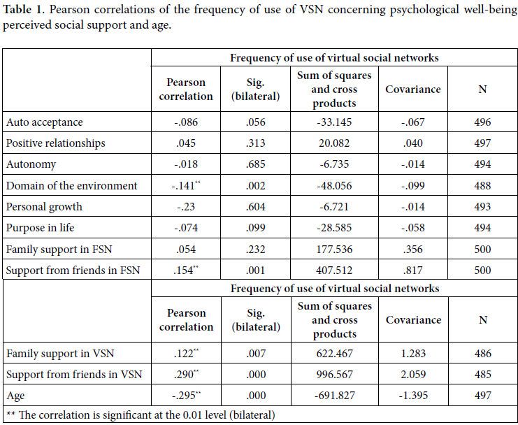 To verify the possible existence of a relationship between the frequency of use of VSN concerning psychological well-being and perceived social support, the Pearson correlation analyzes were carried out, as shown in Table 1. As can be seen, the frequency of use of VSN is related in a negative and statistically significant way with the dimension of well-being, the domain of the environment and with age. And positively with the perceptions of obtaining social support from friends both through the FSN, VSN, and the family through the VSN. Specifically, those people who perceive getting higher levels of social support from their friends through their FSN, as well as by their families and friends in the VSN make more frequent use of VSN.
