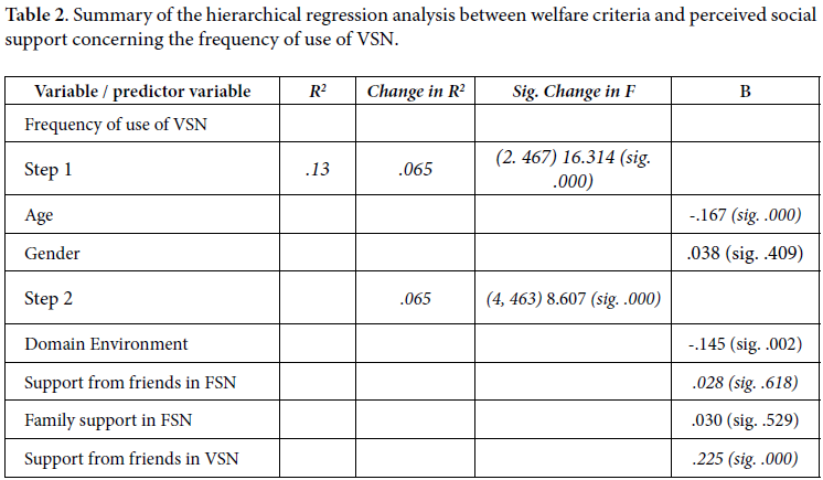 To check whether the perception of the domain of the environment and the perceptions of obtaining social support from friends through the FSN and VSN, and the family through the VSN predict the frequency of use of the VSN, a hierarchical regression analysis that allowed controlling and differentiating the possible effect of gender and age as covariates. In this analysis, only the welfare and social support dimensions that had correlated statistically significantly with the frequency of VSN use were introduced ( Table 2).