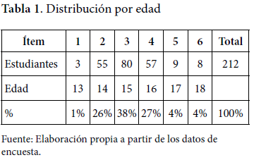 De la muestra tomada a 212 estudiantes de un colegio público del Distrito de Santa Marta, se pudo establecer que la edad prevalente es de 14 a 16 años, con una participación del 91%; le siguen los de 17 y 18 años, con el 8% y los de 13, con el 1%. (Tabla 1).