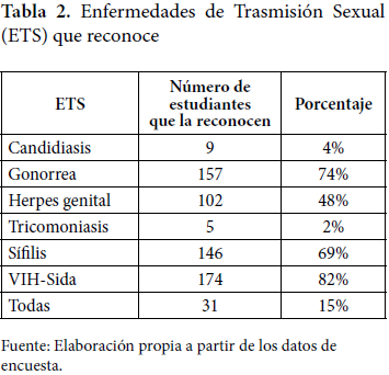 El 82% reconoce el VIH-Sida como ETS; a la gonorrea la reconoce un 74%; a la sífilis, el 69%; al herpes genital, el 48%. El 15% reconoce todas las ETS planteadas en el cuestionario (Tabla 2).