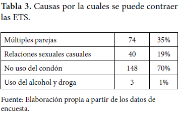 La Tabla 3 hacer referencia a los riesgos para contraer ETS: el 70% considera el no uso del condón como un riesgo; el 35%, las relaciones con múltiples parejas; el 19%, las relaciones sexuales casuales y el 1%, el uso de droga y alcohol.