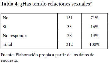 De otra parte, el 71% manifiesta no haber tenido relaciones sexuales y 16% (33 de 212) sí. El 13% no responde (Tabla 4).
