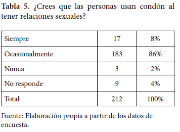 En cuanto al uso de preservativos, el 86% cree que ocasionalmente es usado; el 8%, que siempre es utilizado, y el 6% no responde o cree que nunca es utilizado (Tabla 5).