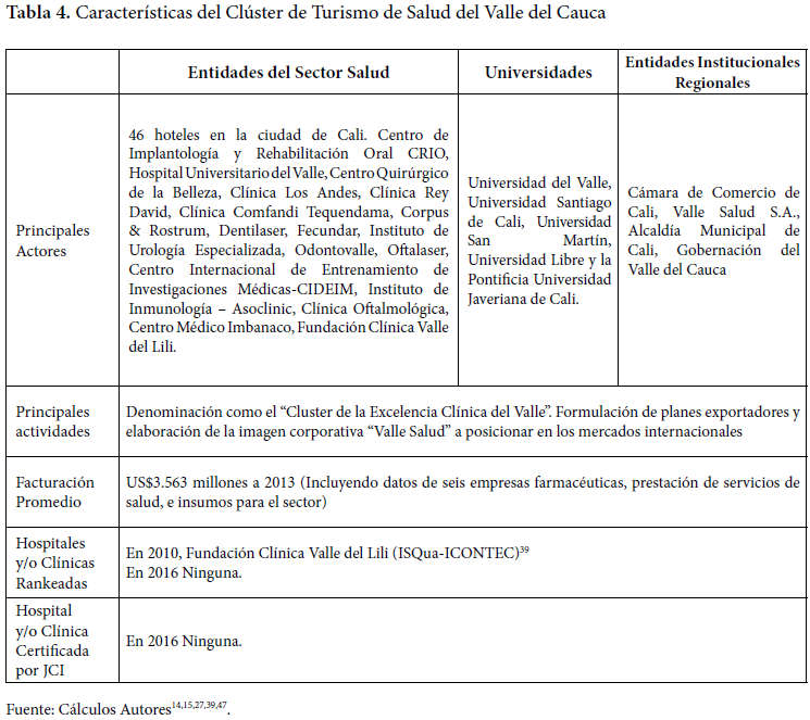 Otro de los clúster en turismo en salud es el adelantado por Cali bajo el nombre de Valle de la Salud, que inició en el año 2008. Las acciones adelantadas por esta iniciativa se han orientado a buscar contactos y relaciones con centros académicos y de C&T. Internamente, la ciudad tiene todo para atender la demanda que llegue, ya que cuenta con 163 cirujanos plásticos que realizan cerca de 50 mil procedimientos al año, lo cual representa una tasa de 1,5 por cada 100 mil habitantes, entre otras fortalezas10,14,24,26,47 ( Tabla 4).