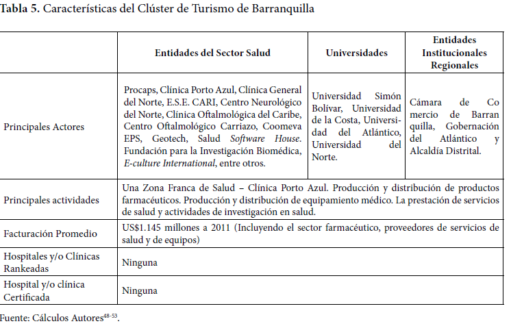 Barranquilla viene desarrollando el clúster de salud del Atlántico desde el año 2011. En esta ciudad se vienen adelantando proyectos tales como el de la Zona Franca de Salud liderado por la Clínica Porto Azul, con una inversión chilena y colombiana cercana a los US$60 millones de dólares, ubicada en Puerto Colombia 48-53 (Tabla 5).