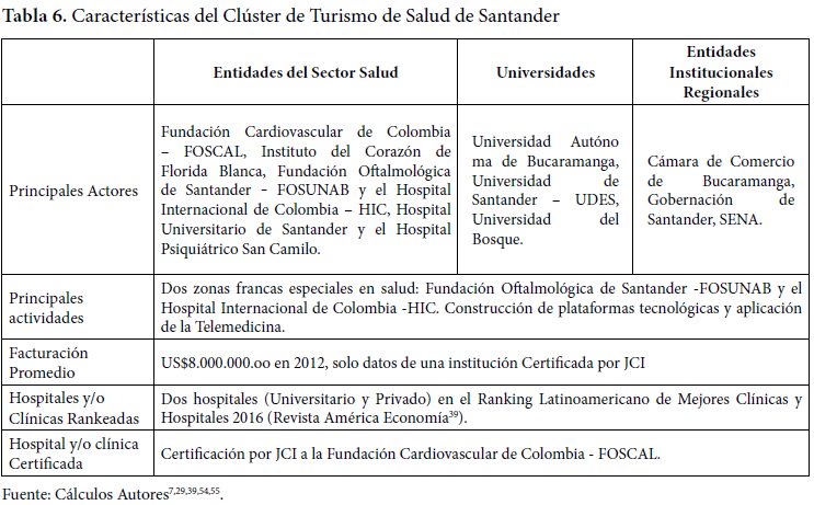 Finalmente, se presenta la iniciativa de Clúster de salud en el Área Metropolitana de Bucaramanga – AMB, desde el año 2011, en donde dos IPS lideran el negocio de la venta de servicios de salud a extranjeros: por un lado, la Fundación Cardiovascular, con la puesta en marcha de la zona franca permanente en salud denominada Hospital Internacional de Colombia; y la otra zona franca permanente en salud, FOSUNAB, liderada por la Fundación Oftalmológica de Santander Carlos Ardila Lule –FOSCAL‒ y la Universidad Autónoma de Bucaramanga – UNAB‒. También tendrá un hotel con 40 aparta suites7,22,29,54,55,56,57,58,59(Tabla 6).