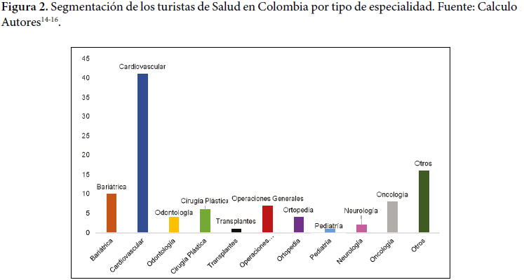 En 2008 entraron a Colombia 44.800 pacientes, de los cuales la mayor proporción la constituyen colombianos residentes en EE. UU, dado que un 29% estuvo motivado por la calidad, 21% por la tecnología, 21% por los costos, 21% por oportunidad y un 8% por otros; además, el tipo de especialidad más buscada fue la cardiovascular con un 41%, le sigue la bariátrica con 10%, operaciones generales 7% y oncología con 6%. En el 2011 arribaron 20.500 pacientes frente a 14.500 que ingresaron en el 201010,14,16 ( Figuras 1 y 2).