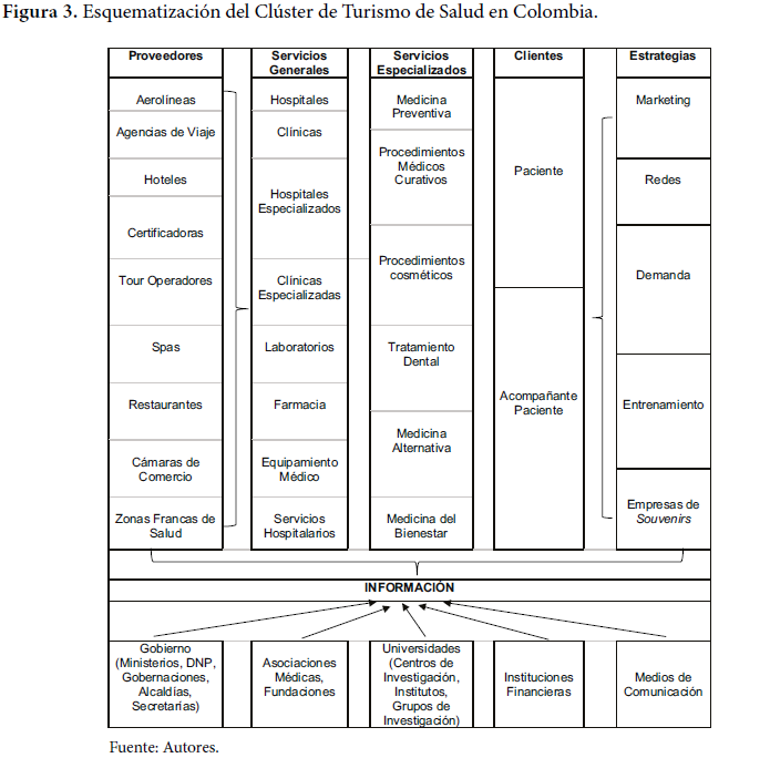 Actualmente en Colombia se está generando infraestructura tendiente a la competitividad internacional mediante creación de zonas francas de salud aprobadas por la DIAN, ubicadas en los departamentos de Risaralda, Atlántico, Nariño, Santander, Bolívar, Antioquia y Cundinamarca. Hay otras dos en proceso. En lo que tiene que ver con las políticas y regulaciones, en Colombia se han hecho ingentes esfuerzos para adaptar la normatividad a la promoción de los servicios de salud exportables19,28,29. En este sentido, se presenta una primera aproximación del clúster de turismo de salud y la agregación de valor respectiva a lo largo de esta (Figura 3).
