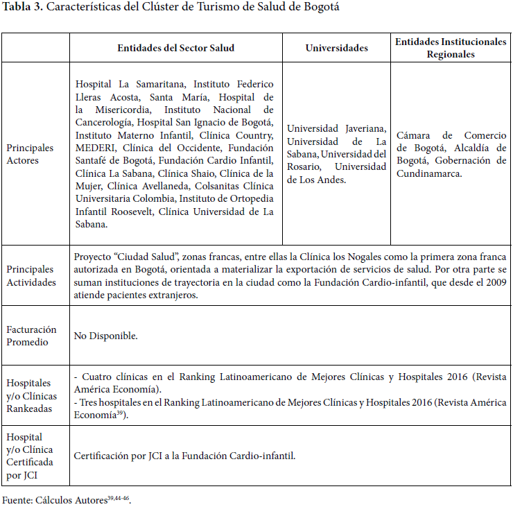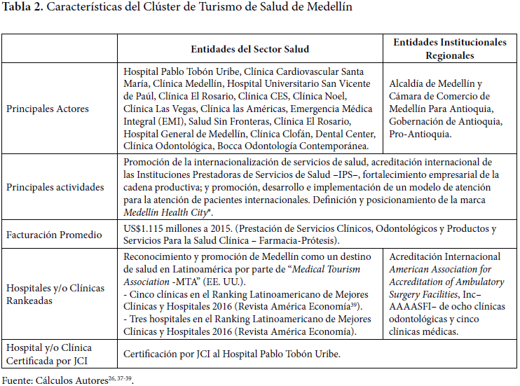 Una de las formas de fortalecer la competitividad del turismo de salud para la exportación es mediante la conformación de clústeres29,31,32,33,34,35; para esto se vienen adelantando iniciativas exitosas en el país, entre las que se destaca Medellín por su exitosa experiencia. Desde el año 2009 inauguró el Clúster de Servicios de Medicina y Odontología y la consolidación del proyecto Salud Sin Fronteras, conformado por un grupo de instituciones que, a través de la marca Medellín Healt City, buscan el reconocimiento internacional como uno de los mejores distritos de salud en América Latina28,36,37,38 (Tabla 2).