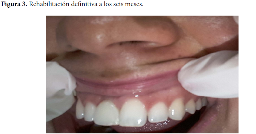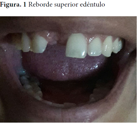 Paciente de 19 años de edad del sexo femenino con antecedentes de buena salud y sin hábitos tóxicos, que fue remitida a la consulta multidisciplinaria por ser portadora de prótesis parcial acrílica superior desajustada desde hace más o menos 18 meses. La paciente refiere inconformidad estética y funcional con la rehabilitación realizada. La misma fue confeccionada de forma inmediata con acrílico de autocurado, por la pérdida del incisivo central superior derecho debido a una fractura de corona y raíz a causa de un trauma dentomaxilofacial.