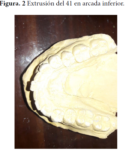 Para emitir el diagnóstico (con participación médica multidisciplinaria) se realizó examen y práctica clínica intraoral, donde se determinó buena higiene bucal y encía normocoloreada. Se observó una concavidad o depresión en zona vestibular del reborde alveolar, donde descansa el diente artificial, definiendo el reborde edéntulo como un reborde Clase I en la clasificación de Seibert (Figura 1). Se percibió también apiñamiento en la región antero inferior, con extrusión del incisivo central inferior derecho (Figura 2), que impacta prematuramente con el antagonista artificial superior (11). En la actividad práctica se realizaron tomas de impresiones en cubetas individualizadas y se obtuvieron los modelos de estudio, registro de relación cráneo mandibular y estudios fotográficos.
