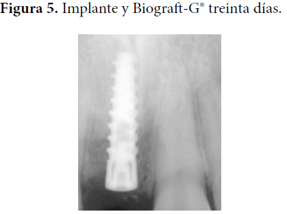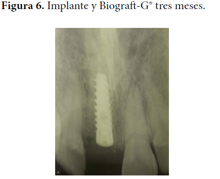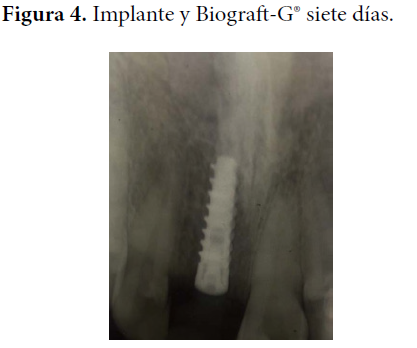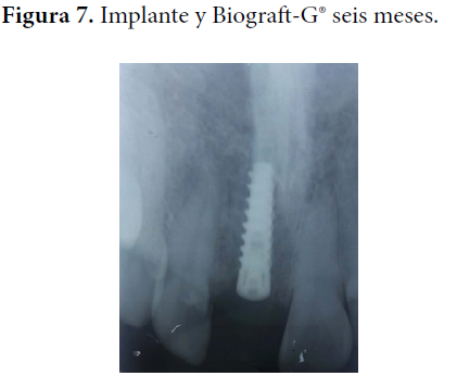 Con respecto al resultado radiográfico, en la Figura 4 se puede observar el implante sumergido en el tejido óseo donde se observa un punteado radiopaco irregular que se corresponde con la presencia de los gránulos (relleno de Biograft-G®) recién colocados. Este aspecto se observa similar al mes de evolucionado en la Figura 5; sin embargo, al paso del tiempo (tres meses) va cambiando el aspecto de la radiopacidad semejándose más a los tejidos óseos vecinos, como muestra la Figura 6. En la evolución de los seis meses (Figura 7) se observa una radiopacidad análoga a los tejidos contiguos. Al observar estos cambios de radiopacidad descritos en el tiempo de evolución, se puede inferir una correspondencia con la reabsorción del material Biograft-G® y la sustitución del mismo por hueso neoformado.