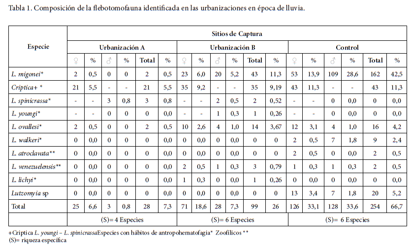 Las especies encontradas en las viviendas en el área urbana fueron Lutzomyia youngi (Feliciangeli & Murillo), Lutzomyia spinicrassa (Morales, Osorno-Mesa, Osorno & Hoyos), Lutzomyia migonei (França), Lutzomyia ovallesi (Ortiz), Lutzomyia walkeri (Newstead), Lutzomyia venezuelensis (Floch & Abonnenc), Lutzomyia atroclavata (Knab)y Lutzomyia lichyi (Floch & Abonnenc), de las cuales el 62,5% corresponden a especies con hábitos de antropohematofagia (Tabla 1).