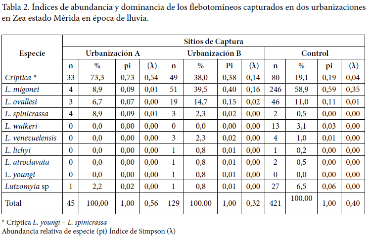 En la urbanización A, las hembras de una especie criptica entre L. youngi- L. spinicrassa fue la que presentó mayor abundancia y dominancia (pi= 0.73 y λ = 0,54), mientras que en la urbanización B y en el área control la especie más abundante fue L. migonei, (pi= 0,40 y λ = 0,16), y (pi= 0,59 y λ = 0,35), respectivamente (Tabla 2).