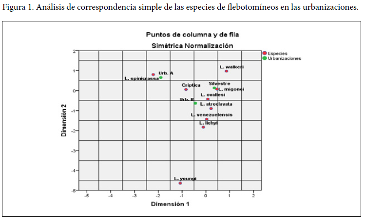 El análisis de correspondencia simple entre las especies de flebotomíneos y las urbanizaciones se muestra en la figura 1, encontrándose una asociación de los machos de la especie L. spinicrassa con la urbanización A. Por el contrario, las hembras crípticas L. youngi – L. spinicrassa mostraron asociación con las dos urbanizaciones.