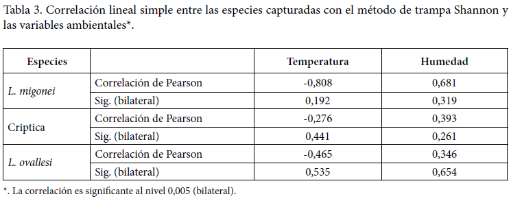 Los resultados del análisis de correlacion lineal de las especies para L. migonei muestran una relacion directa con la humedad e inversa con la temperatura, siendo estos valores no significativos, mientras que para la especie criptica L. youngi – L. spinicrassa y L. ovallesi no se evidenció relación con las variables temperatura y humedad presentando valores no significativos para la correlacion de Pearson (Tabla 3).