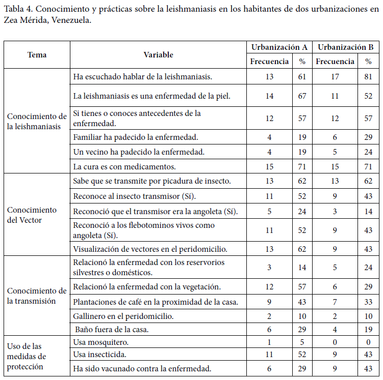 Los resultados sobre las características epidemiológicas asociadas a la transmisión muestran las deficiencias encontradas sobre el conocimiento y prácticas acerca de la leishmaniasis en los habitantes de las dos urbanizaciones (Tabla 4).