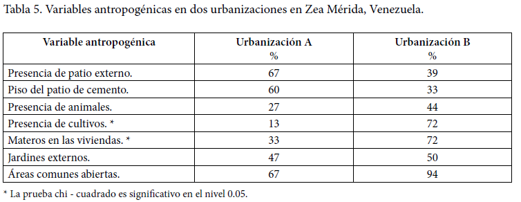 En cuanto a las características asociadas al riesgo de transmisión, el análisis solo mostró diferencias significativas entre las variables, una presencia de cultivos y materos dentro de las viviendas entre las urbanizaciones < 0,05 (presencia de cultivos: X2= 11,444; gl=1; Sig. = 0.001; materos en las viviendas: X2=4,991 gl= 1; Sig. = 0.029). Para el resto de las variables las diferentes encontradas no fueron significativas, p > 0,05 (Tabla 5).