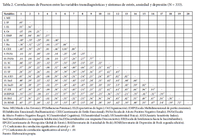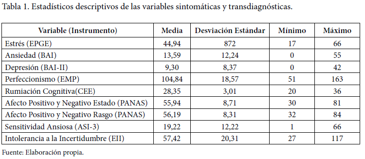 El objetivo de la investigación fue establecer la relación entre las variables perfeccionismo, rumiación cognitiva, afecto positivo-negativo, sensitividad ansiosa, e intolerancia a la incertidumbre, con las problemáticas asociadas a ansiedad, estrés y depresión. Los resultados encontrados permiten afirmar que el objetivo se cumplió parcialmente dadas las correlaciones estadísticamente significativas obtenidas entre los síntomas de ansiedad con sensitividad ansiosa, rumiación cognitiva, afecto positivonegativo e intolerancia a la incertidumbre; asimismo en depresión y estrés excepto la sensitividad ansiosa, tal como fue previsto hipotéticamente según las investigaciones previas consultadas sobre la capacidad predictiva de las variables transdiagnósticas para las problemáticas emocionales y afectivas5,8,13,16,21.
