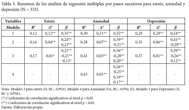 A continuación, en la tabla 3, se detalla el análisis de regresión múltiple. Para el estrés se obtuvo un R² de 0,20 el cual presenta un mejor ajuste de los predictores intolerancia a la incertidumbre, rumiación y PANAS Rasgo, seguido ansiedad con un R² de 0,43 y su predictor de mejor ajuste sensitividad ansiosa, rumiación cognitiva, PANAS rasgo y la intolerancia a la incertidumbre; por último, para depresión el predictor que mejor ajuste tuvo fue la intolerancia a la incertidumbre, la rumiación cognitiva, y el PANAS rasgo.