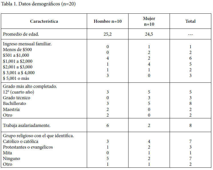 Este estudio iba dirigido a adultos jóvenes residentes en Puerto Rico entre las edades de 21 y 30 años. Para reclutar los y las participantes se utilizó una combinación de muestreo por criterio y por conveniencia.17 En el muestreo por criterio los y las participantes tienen que cumplir con algún criterio establecido por el investigador y la investigadora. Para el presente estudio el criterio era que tuvieran entre 21 y 30 años. En el muestreo por conveniencia se incluyen en el estudio los primeros participantes que cumplen con el criterio mencionado previamente y que están disponibles para participar. Participaron 10 hombres y 10 mujeres jóvenes quienes estaban en una relación de pareja con alguien del sexo opuesto. Según puede apreciarse en la Tabla 1 las edades fluctuaban entre 21 y 29 años con una media de 25 años. Un poco más de la mitad (55%, n=11) convivía consensualmente con otra persona, y la mayoría residía en el área metropolitana de San Juan. La religión que más afiliación tiene es la católica. No obstante, igual cantidad de personas expresó no identificarse con ninguna religión. Por último, la mayoría tiene un grado postsecundario.