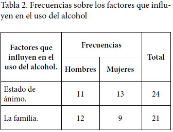 Según se observa en la Tabla 2, la categoría “factores que influyen en el uso del alcohol” generó las siguientes subcategorías: a) el estado de ánimo; b) la familia; c) los medios de comunicación; y d) las amistades. A continuación los resultados por subcategorías.