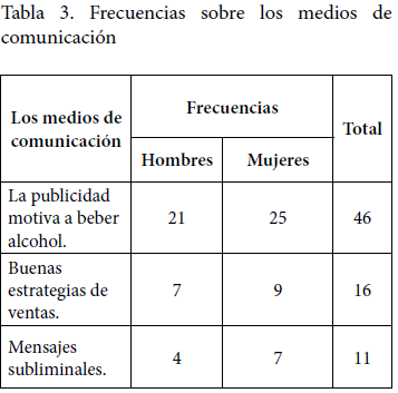 Se les preguntó a los y las participantes directamente sobre los medios de comunicación. Surgieron las siguientes subcategorías: a) buenas estrategias de venta, b) la publicidad motiva a beber alcohol, y c) mensajes subliminales.