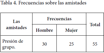 Los hombres y las mujeres hicieron alusión a las amistades. Los hombres tendieron a enfatizar más el aspecto de la socialización y las mujeres las amistades más cercanas, aunque el énfasis de uno u otro no era muy notable. La subcategoría que prevaleció lo fue la presión de grupo. Si se observa la Tabla 4 para los y las participantes esta fue la razón principal para que los jóvenes usaran y abusaran del alcohol.